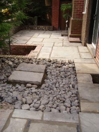 Patios & PathwaysAs with driveways, patios and pathways can be a great focal point for the rear garden. There are many choices of patio surfaces, here's just a few examples.This raised patio allows for wheelchair access from the house.A ramp from the raised patio leads gently down to a rotunda and access to the lawn.Using a variety of of surface finishes creates an unique look to paths and patios. This path was built using slabs, bricks and pebbles.